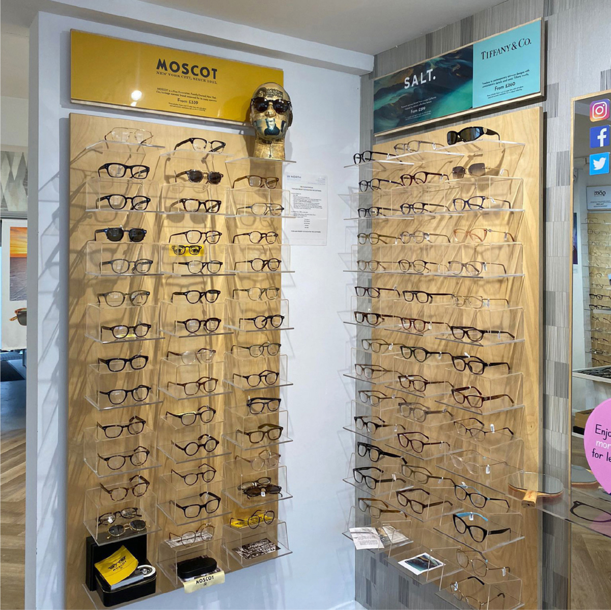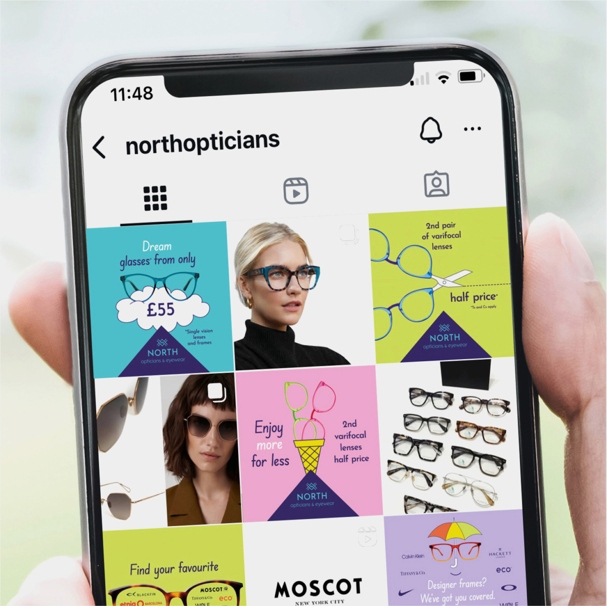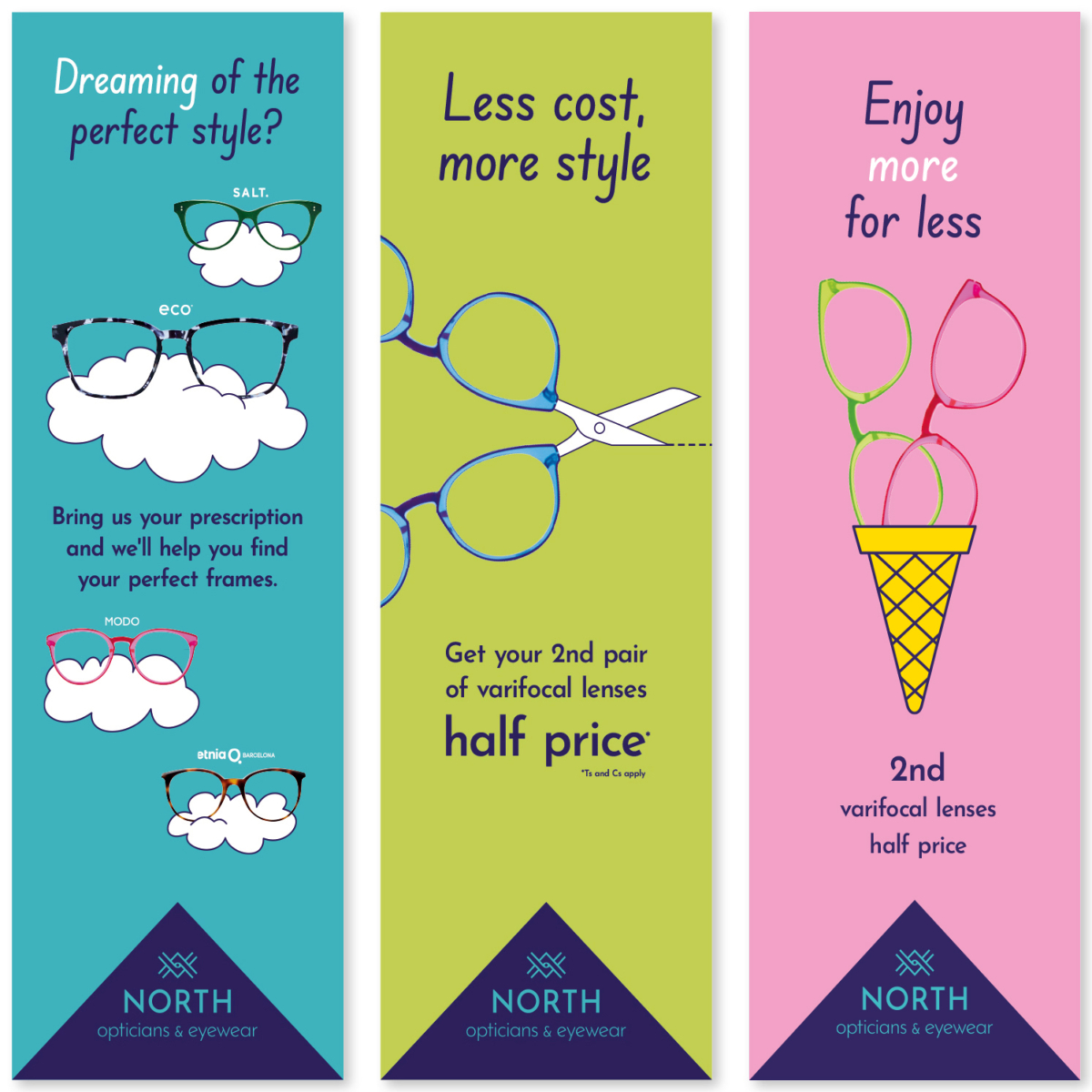 We widened their brand colour palette and illustration style – incorporating photographic designer frames as key elements of witty illustrations that could be used to convey clear messages to customers. A set of illustrations were ultimately produced in house to keep things as cost effective and streamlined for the client as possible. We reviewed how the existing logo could be used within a triangle that could focus the eye to literally ‘look North’ and defined key brand messaging. We then created a suite of literature and communications that felt both confident and consistent. We devised a bespoke brand display system using pre-printed brand panels which slot interchangeably into acrylic apertures for a high-end feel throughout store. Bespoke acrylic pricing signage panels were also designed and produced.