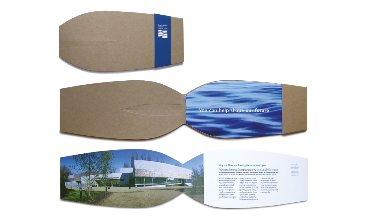 A clean sans-serif typeface was teamed with the logo to create a contemporary feel. Stainless steel signage was produced for the celebrated building designed by David Chipperfield Architects. I designed a bespoke investor brochure with a paper engineered cover in the shape of a rowing oar, as well as oar shaped inserts.