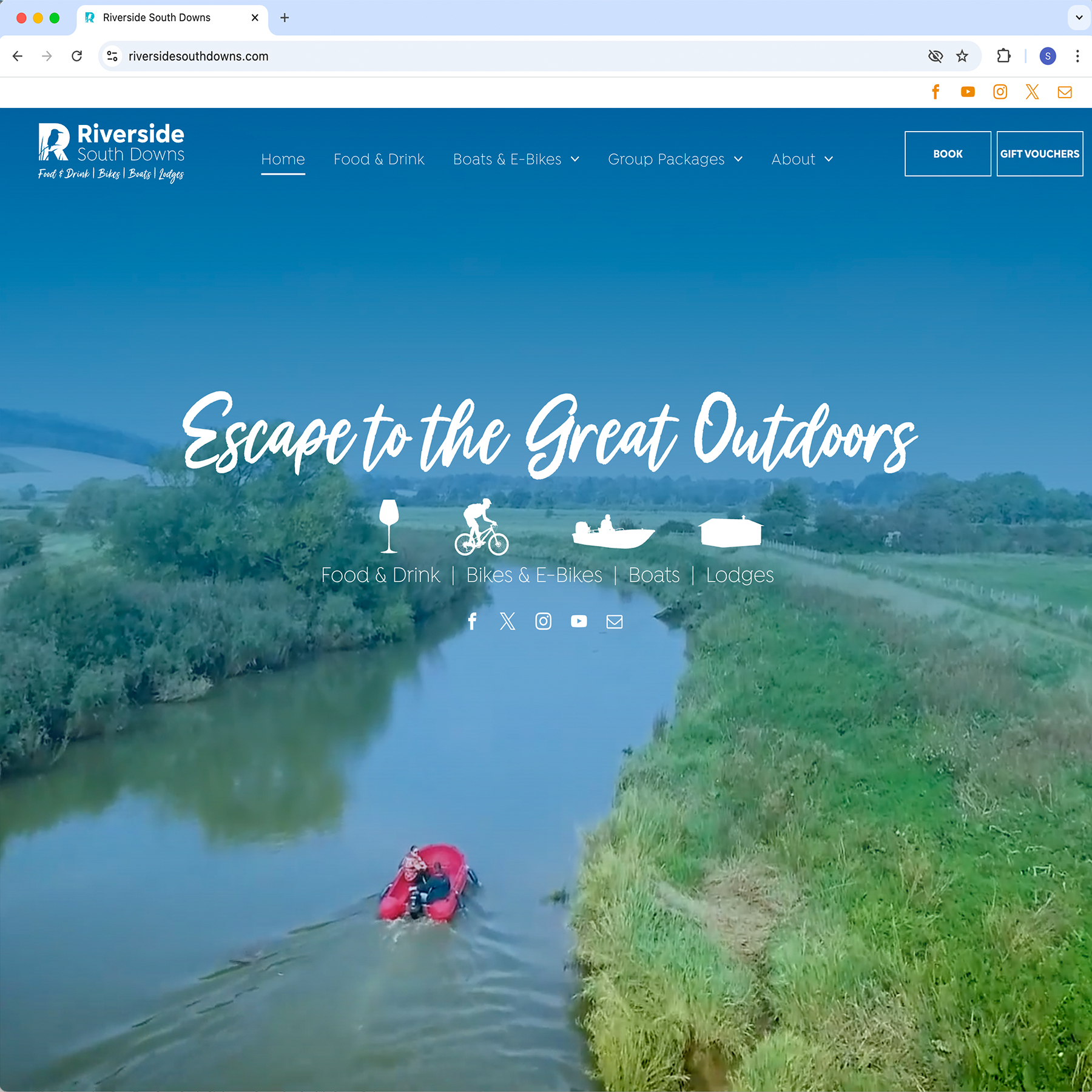 We were asked to provide guidance on naming and to create a new brand identity and brand hierarchy. Part of the challenge would be in presenting a diverse range of offerings to a diverse client base while maintaining a strong cohesive brand over all. Inspiration for the new branding came in feathered form. We spotted no less than eight Kingfishers in a single afternoon’s paddleboarding and, being stunningly agile, yet beautiful and serene, the bird seemed like the perfect mascot for Riverside South Downs. A new logo was crafted that nestled the Kingfisher into the counter of Riverside’s initial R. We also created a new illustrated visual style as a serene yet flexible backdrop. We then rolled out the new brand package across a wide range of applications including activity centre signage, uniforms, banners, menus, stationery, vehicle branding, leaflets, social media assets and website style. On completion of the project owner Terry said: “Working with Susan has been an absolute pleasure from start to finish. Embarking on our complete rebrand was quite daunting, however Susan took the time to understand our business ethos and developed our new brand accordingly, which far exceeded our expectations. Professional, knowledgable and extraordinarily talented, Susan guided us through the entire process, I would not hesitate to recommend.”