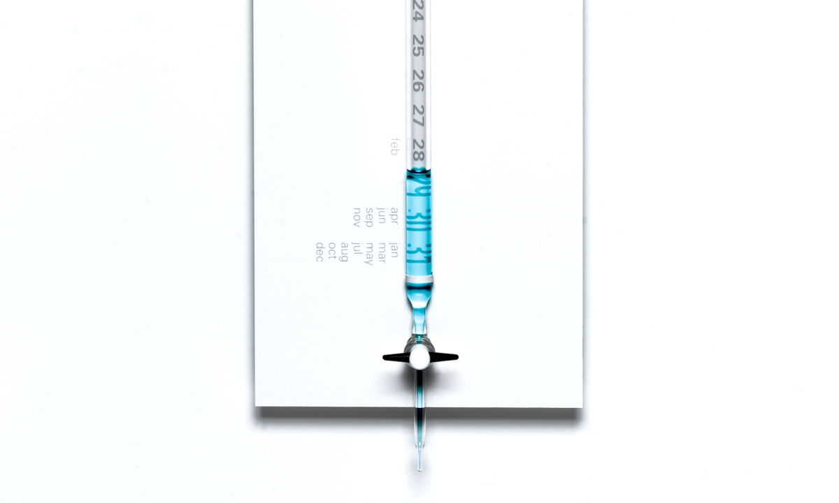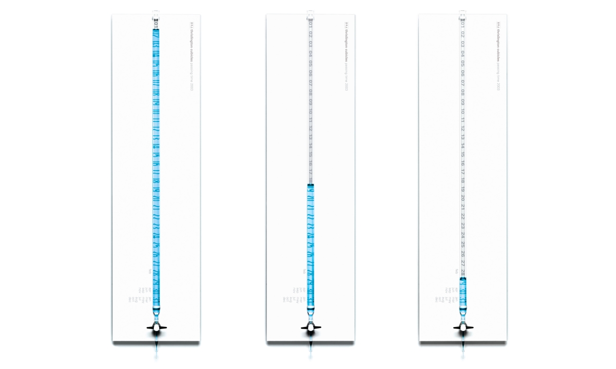 The dates for each month were screen printed on the wall mounted acrylic calendar and a refillable glass tube was suspended in front. The tap at the base of the allowed water to be passed through each day so changing the day of the month displayed. The calendar appeared in the D&AD (Design and Art Direction) awards annual.